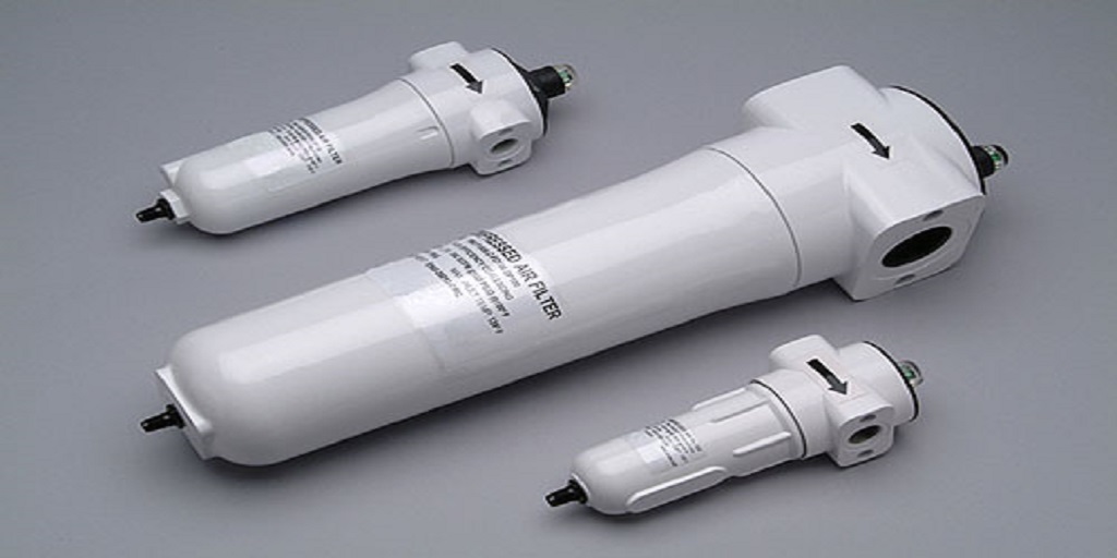 In order to prevent oil and moisture from passing through, coalescing filters are used. The compressed air comes into the filter through the intake port, travels down through the filter, and leaves through the discharge port.