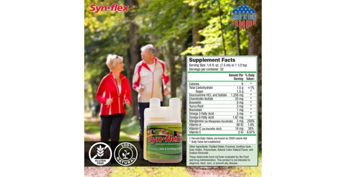 Synflex 1500 Formula is Synflex America’s flagship liquid joint supplement product. It contains 1500 milligrams of glucosamine HCL and glucosamine sulfate, as well as 25 milligrams of chondroitin, and is recommended for athletes and active individuals who may experience joint pain, stiffness, or discomfort after performing intense activities. Synflex 1500 Formula additionally contains 10 milligrams of white willow bark, which is an ingredient that has been used for centuries in traditional medicine to address joint issues. Furthermore, it contains omega-3 and omega-6 fatty acids, in addition to boswellin, yucca powder, manganese (ascorbate), bromelain, and vitamins A, C, and E.